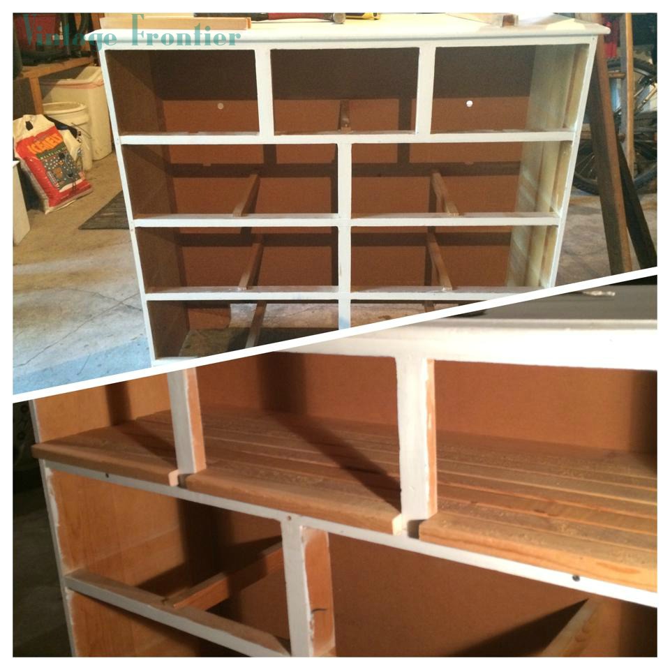 Our first step was sanding the whole unit including drawer fronts. It had been painted several times, and it ate through about seven sanding pads just to get a smooth surface. We used furring strips cut to length for the shelf to give the piece a more rustic look….it reminded me of hardwood flooring. In the above picture we just cut three pieces of furring strip to fit in between the drawers, after looking at it for a while, and with some input from my genius mother, we decided to cut one long piece for the front and notch out where the spacers were. I put two coats of polyurethane on the furring strips to give them a little extra protection and used a furniture wax on the top to keep it from beat up.