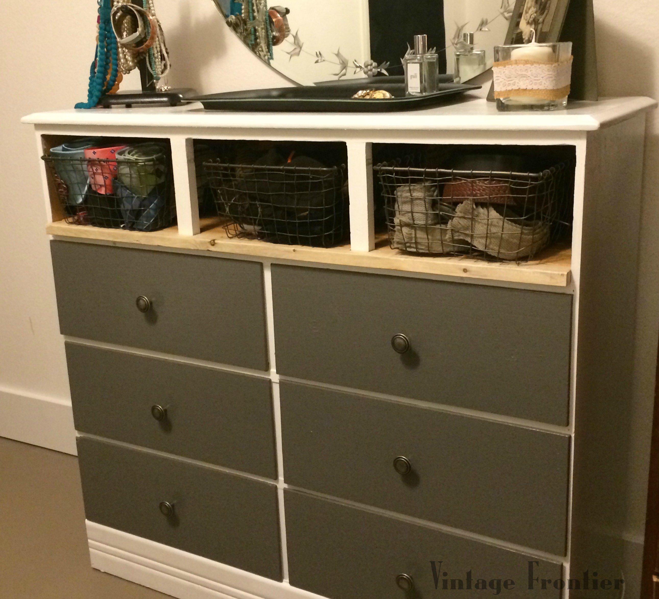 The top three drawers were broken so as we looked at it we decided we would make the top drawers into a shelf, paint the whole thing white and the drawer fronts gray and get some new hardware.
